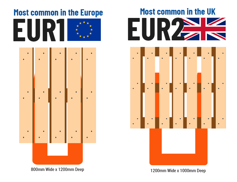 There are two common pallet sizes in use in the UK. An EUR1 pallet is 800mm wide x 1200mm deep (front-to-back). An EUR2 pallet is 1200mm wide x 1000mm deep. Note that both of those pallets have a 1200mm dimension. The important thing is that the top boards of the pallet should be going into the racking, not running left-to-right, because those boards give the pallet strength when it is supported on the beams.