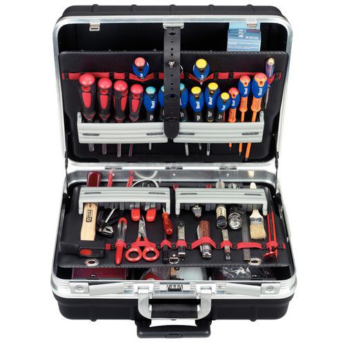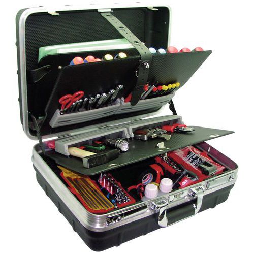 Case containing: 5 accessories: 1 universal joint, 1 handle, 1 ratchet, 2 extensions, 1 spring hooker, 2 polyethylene drums, 1 pen oil gun, 3 pin drivers, 1 electrician's scissors, 1 electrician's knife, 1 adjustable wrench, 4 tube keys 4, 5, 6 and 8 mm, 15 socket screw keys from 0.28“ to 3/8“, 10 socket screw keys from 1 to 6 mm, 1 pencil magnet, 13 mixed keys from 3.2 to 14 mm, 2 shunt cords, 1 double tape measure, 13 sockets from 3.2 to 14 mm, 11 sockets from 3/16” to 9/16”, 1 soldering iron, 2 red and black wire grips, 2 sets of gauges thickness in mm and inches, 1 pen torch, 6 needle files, 1 riveter's hammer, 1 insulated mirror, 3 welding tools, 2 red and black probes, 2 1/2 round pliers straight and bent, 1 stripping pliers, 1 CI testing pliers, 3 tweezer pliers: straight, bent, reversed, 1 magnetic pencil, 1 reversible circlip pliers, 2 cutting pliers: diagonal, frontal, 3 crocodile pliers: red, black, nickel-coated, 2 pliers: multi-grip and universal, 1 silk brush, 1 tracing p