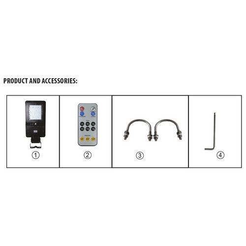 With motion sensor: The light charges during the day and comes on automatically at night. Operating modes: 1) Constant light mode: The lamp comes on automatically at night and maintains a constant 60% brightness for 4 hours, then switches to motion sensor mode. 2) Motion sensor mode: The lamp automatically comes on at 100% brightness when motion is detected within a range of ≤ 12 metres, then drops to 30% brightness after 20 seconds without any movement.