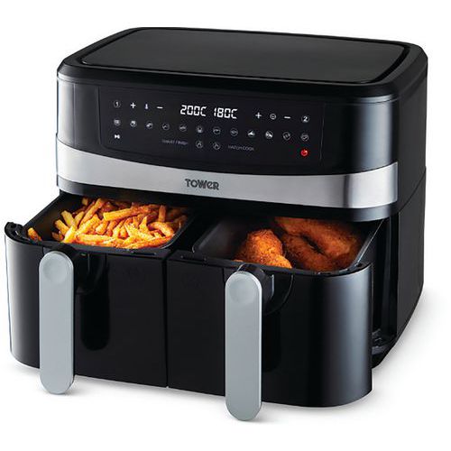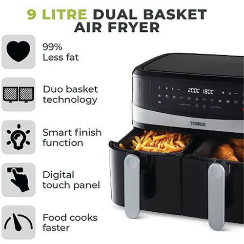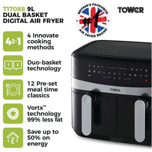 9 Litre Dual Basket Air Fryer - Energy Efficient - Vortx Tech - Tower