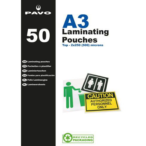 A3 laminating pouches. Photo quality and UV resistant. Suitable for any type of machine that is compatible with A3-sized documents. Ideal for schools, businesses and crafting.