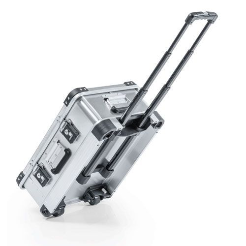 Sturdy, high-quality mobile case with integrated castors and pull-out handle.