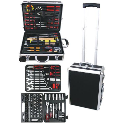 Contains: set of 9 flat spanners, bit holder with handle and 24 bits of 1/4", extremely complete set of socket keys 1/4" and 3/8" with short sockets and long models, set of 10 hex keys from 1.5 to 10 mm, 3 precision screwdrivers and 3 standard slot screwdrivers, 3 Philips screwdrivers for fine mechanics and 3 standard Phillips screwdrivers, 2 hex screwdrivers, punch, 2 pin drivers, adjustable spanner 8", pliers for 10" water pump, lateral cutting pliers, pointed pliers, pliers-vice, combined pliers, steel brush, tape measure 5 m, universal knife with reserve blades, bow saw mini-frame with saw blades, workbench hammer, rubber mallet, mini-file, standard file and round file. The case also contains a 24 volt and 380 volt voltmeter.