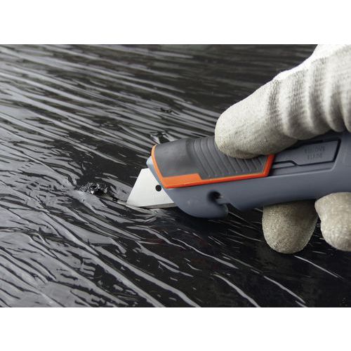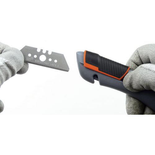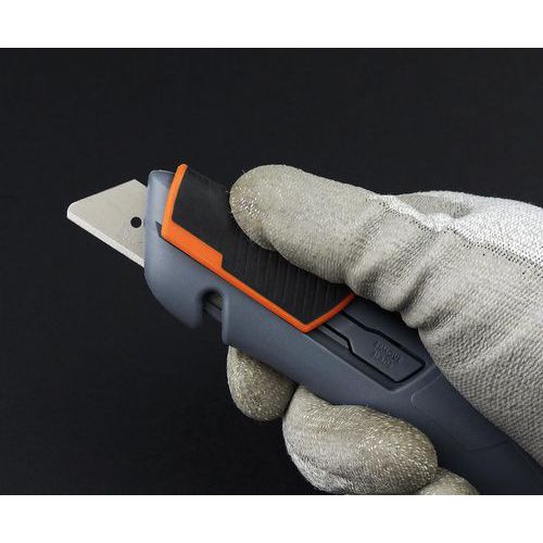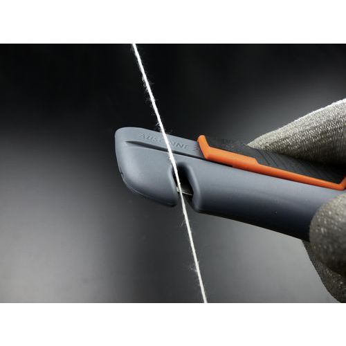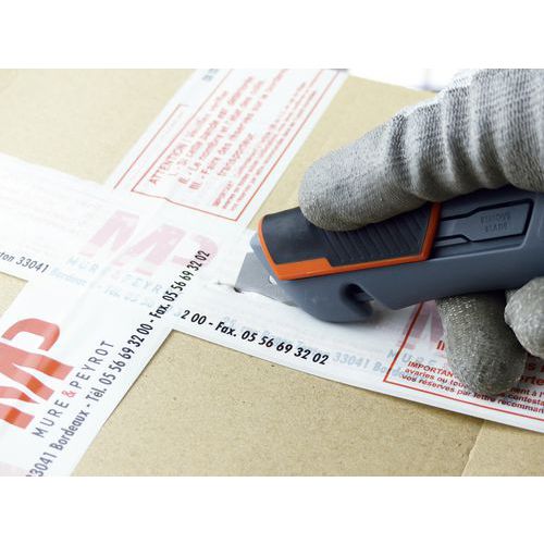 Dual-material safety knife with a retractable blade. Perfect for handling work as well as for opening boxes and packaging. The blade retracts automatically when the slider is released. Supplied with a blade with rounded end, reversible for extended use. Suitable for both right-handed and left-handed users. Dual-material ribbed non-slip slider for improved grip. Equipped with an integrated cord cutter. Compatible with Zicou reel.