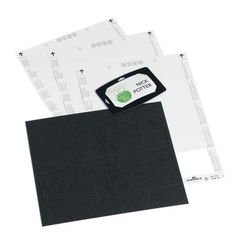 The Durable badge holder set is a handy kit of 20 recycled-cardboard badge holders with printable badges in 54 x 90-mm format. Each badge consists of a sturdy cardboard badge holder and printable badges. Badges can be used in portrait or landscape format for more flexibility. The set includes 20 badge holders spread over 5 sheets (4 badges per sheet) and 3 printable A4 BADGEMAKER sheets for a total of 30 badges. BADGEMAKER printable inserts are available separately to refill your kit.