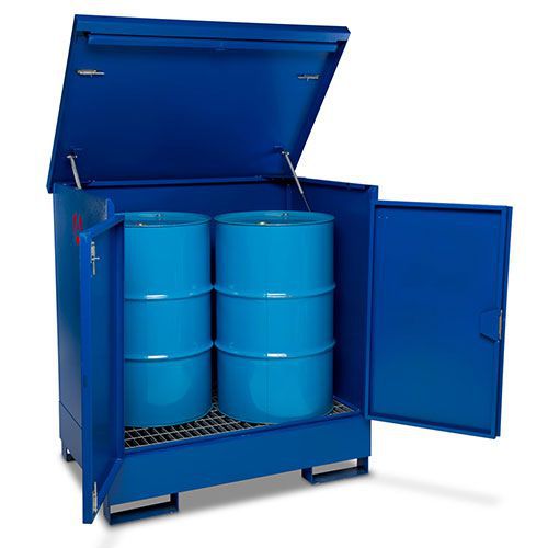 Robust design with heavy-duty doors and a 5-lever deadlock. Fully compliant with COSHH regulations for hazardous materials. Wide-opening doors and lift-up lid for easy access. Integrated spill pallet with large sump capacity. Fork skids for easy manoeuvrability. Raised removable floor for convenient cleaning and maintenance. Fits 2 to 4 205-litre drums.