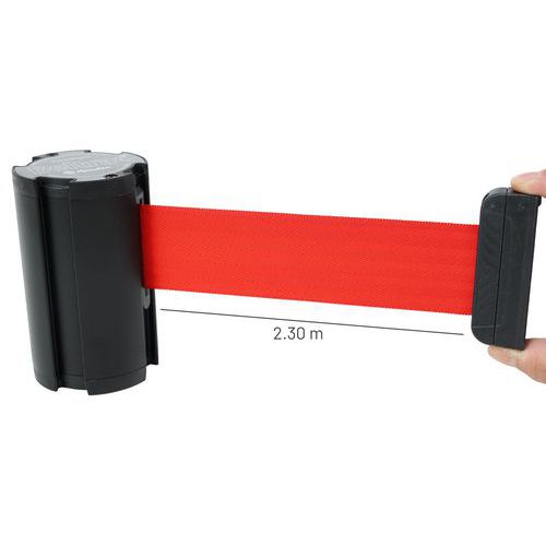 Wall-mounted belt retractor for closing off or preventing access to an area. Easy to remove thanks to its self-locking belts. Sturdy and reliable belt mounting. For outdoor use.