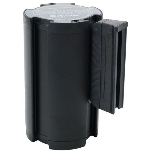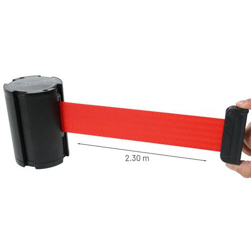 Wall-mounted belt retractor for closing off or preventing access to an area. Easy to remove thanks to its self-locking belts. Sturdy and reliable belt mounting. For outdoor use.