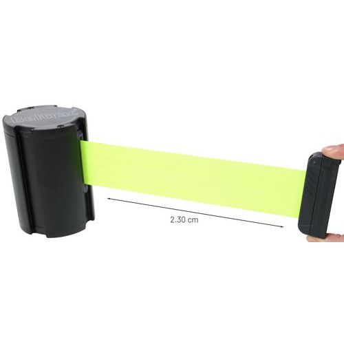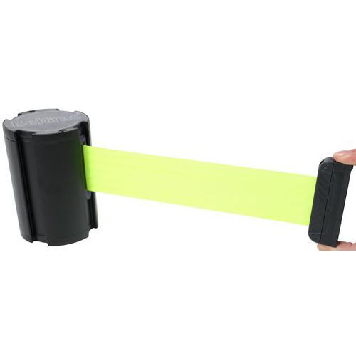 Wall-mounted belt retractor for closing off or preventing access to an area. Easy to remove thanks to its self-locking belts. Sturdy and reliable belt mounting. For outdoor use.