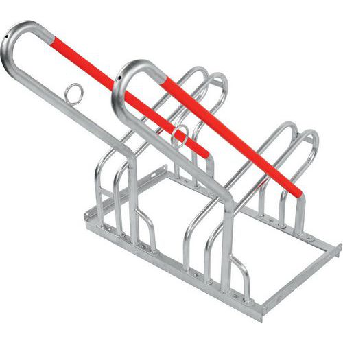 Hot-dip galvanised steel for long service life. Quick and easy to install. Suits up to 64mm tyre width. Single-sided or double-sided parking. The racks can be bolted together to create multiple parking combinations.