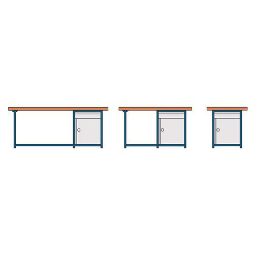 Robust workbench suitable for workshop use. With a solid plywood top. With a workbench cabinet featuring a lockable door and a drawer for safely storing your equipment.