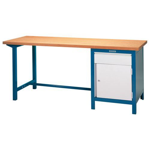 Robust workbench suitable for workshop use. With a solid plywood top. With a workbench cabinet featuring a lockable door and a drawer for safely storing your equipment.