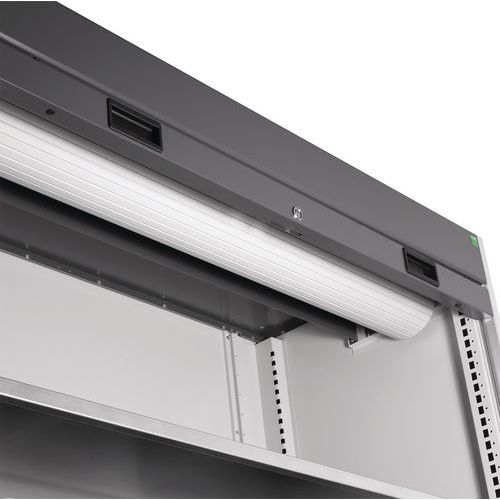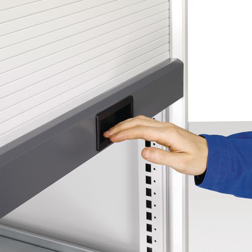 Smooth gliding roller shutter doors neatly store away in the upper section of the cupboard. Fully lockable to keep contents secure. Adjustable steel shelves. Mid level hand grip allows easy operation. Drawer depth mm: 175. Delivered assembled and ready to use.