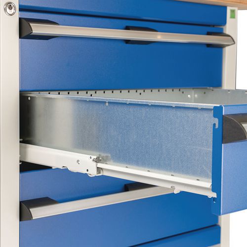 The drawers have 100% roller bearing slides that open the drawers fully and smoothly, even if they are filled up.