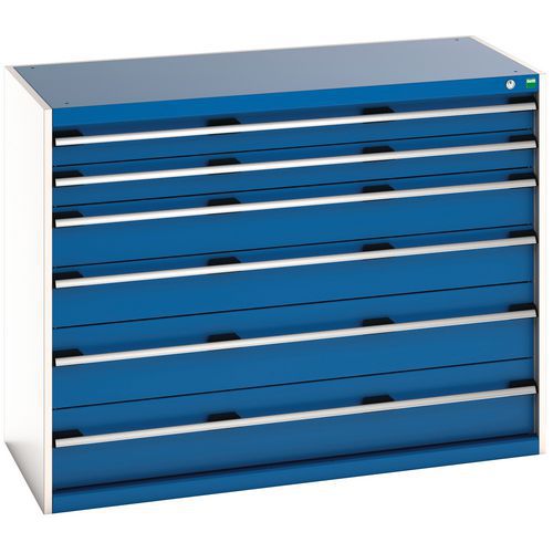 Different drawer sizes offer efficient storage for tools and parts. The drawers have a lock system that prevents more than one drawer from being opened at the same time. The 75kg UDL drawers have 100% roller bearing slides that open the drawers fully and smoothly, even if they are filled up. The central 3-point locking system offers superb security. The steel frame has a smart, powder-coated finish that is both resilient and professional in appearance. The ergonomic handle has a removable labelling strip and a transparent plastic cover. Delivered fully assembled. Dimensions measured as height, width, and depth: 1000 mm (height) x 1300 mm (width) x 650 mm (depth). Made in UK Customer warranty : 10 years