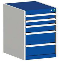 Different drawer sizes offer efficient storage for tools and parts. The drawers have a lock system that prevents more than one drawer from being opened at the same time. The 75kg UDL drawers have 100% roller bearing slides that open the drawers fully and smoothly, even if they are filled up. The central 3-point locking system offers superb security. The steel frame has a smart, powder-coated finish that is both resilient and professional in appearance. The ergonomic handle has a removable labelling strip and a transparent plastic cover. Delivered fully assembled. Dimensions measured as height, width, and depth: 700 mm (height) x 525 mm (width) x 650 mm (depth). Made in UK Customer warranty : 10 years