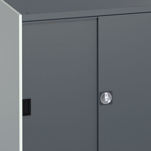 Sliding door is fully lockable, with a central 3 point locking system. Ideal for when office space is at a premium, with little door opening leeway needed. Robust welded steel reinforced frame for heavy duty environments. Galvanised steel shelving is wholly adjustable with a 25mm pitch. Powder coated frame is both smart and scratch resistant. Cupboard delivered assembled and ready to use.