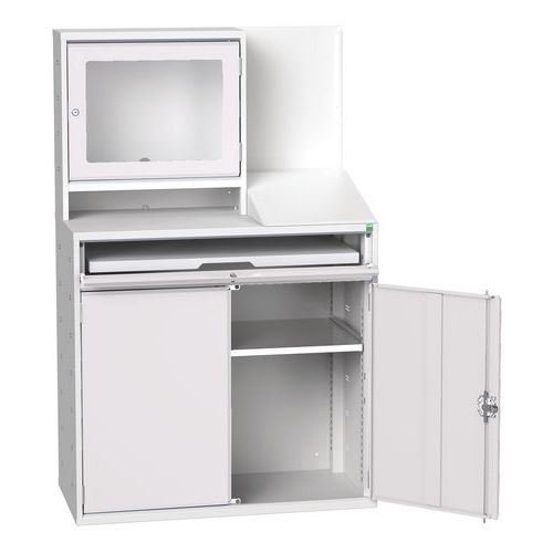 The slide-out keyboard tray and cupboard can both be safely locked.