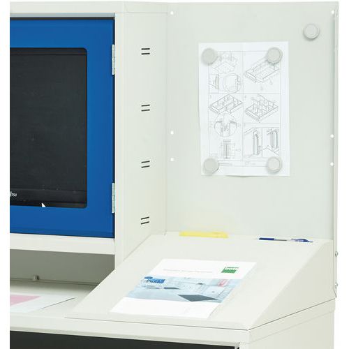 The slide-out keyboard tray and cupboard can both be safely locked.