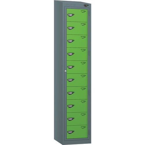 Manufactured in the UK with a certified carbon-zero rating, helping your organisation meet sustainability goals. Ten individual compartments allow secure storage for each employee, while a master door enables quick and easy restocking of all compartments at once. Each compartment and the master door have high-quality cam locks (keys included). Coated with BioShell technology to guard against bacteria and viruses, including COVID-19. Vented door design promotes airflow to reduce unpleasant odours. Suitable for heavy-duty commercial use and is built from premium-grade steel. Pre-drilled side panels allow lockers to be nested and bolted together for efficient storage banks. Meets BS4680:1990 standards and carries FlameZero certification for added peace of mind. The sloping design keeps the top clear, promoting tidiness and safety. 10-Year Guarantee. Ideal for manufacturing plants, healthcare facilities, hospitality or laboratories. Customer warranty : 10 years