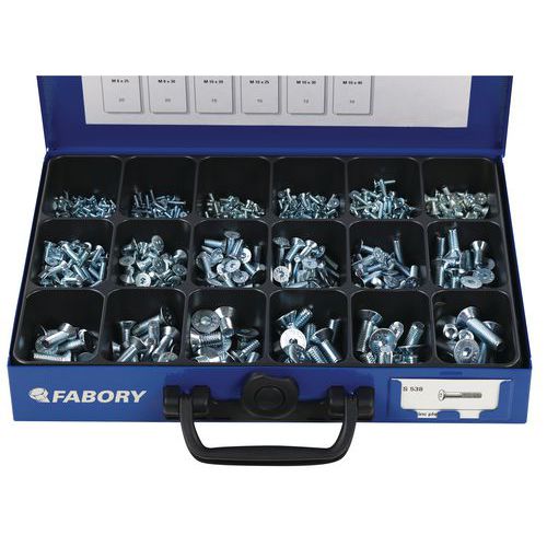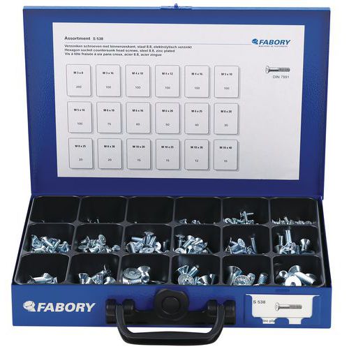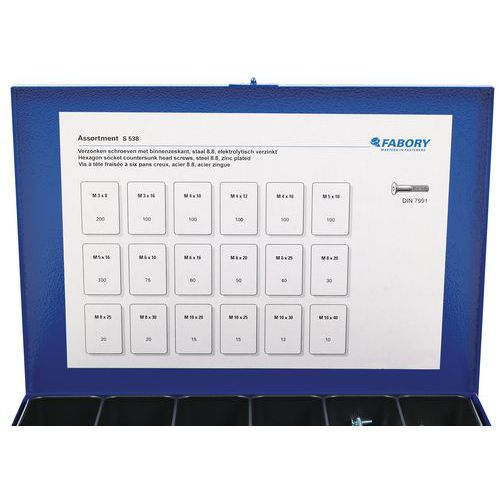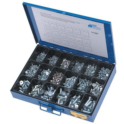 Metal case contains: M3 x 8 - 200 parts / M3 x 16 - 100 parts / M4 x 10 - 100 parts / M4 x 12 - 100 parts / M4 x 16 - 100 parts / M5 x 10 - 100 parts / M5 x 16 - 100 parts / M6 x 10 - 75 parts / M6 x 16 - 60 parts / M6 x 20 -50 parts / M6 x 25 - 40 parts / M8 x 20 - 30 parts / M8 x 25 - 20 parts / M8 x 30 - 20 parts / M10 x 20 - 15 parts / M10 x 25 - 15 parts / M10 x 30 - 12 parts / M10 x 40 - 10 parts