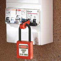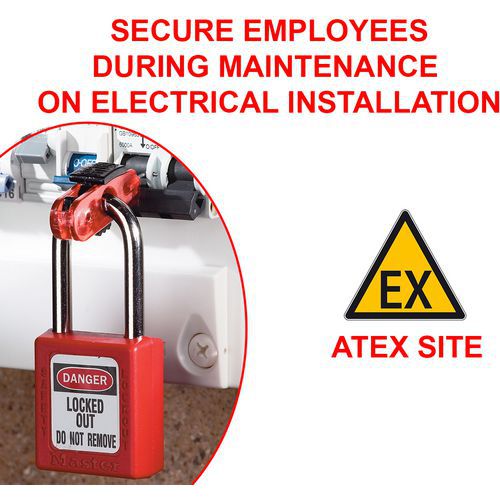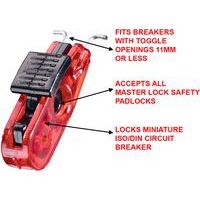 - The patented device fits circuit breakers with toggle switches of 11 mm or less and works with all Master Lock padlocks and lockout hooks.