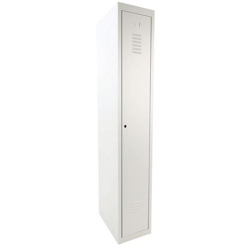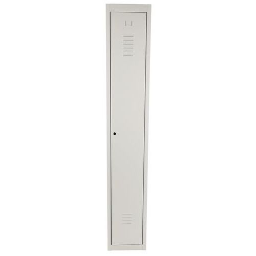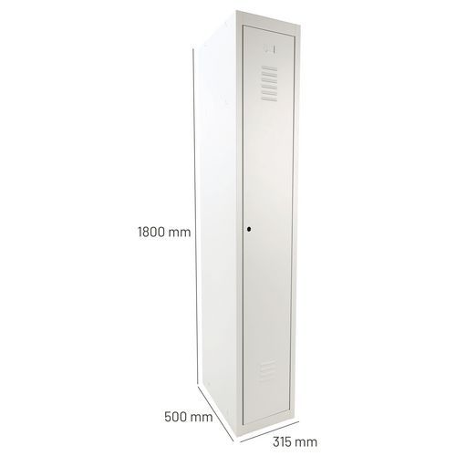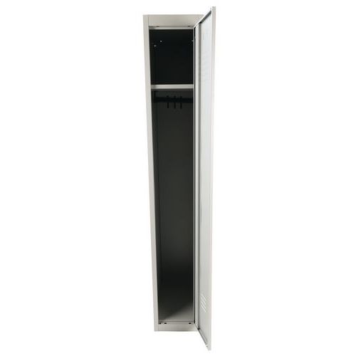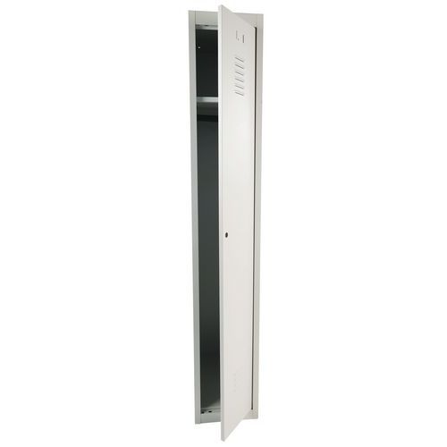 Interior includes a storage compartment at the top composed of a middle shelf, and a wardrobe space at the bottom with one rail and two hooks. Locker supplied with round-head cam lock and two keys.