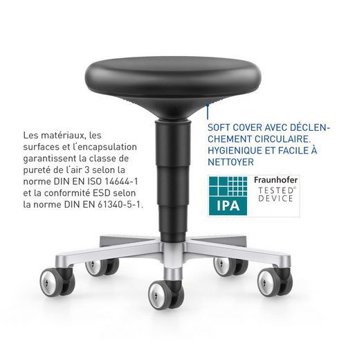 | Product Name | Cleanroom stool with castors, Type of base: 5 feet, Seat model: Low, Foot rest: no, Seating width: 400 mm |