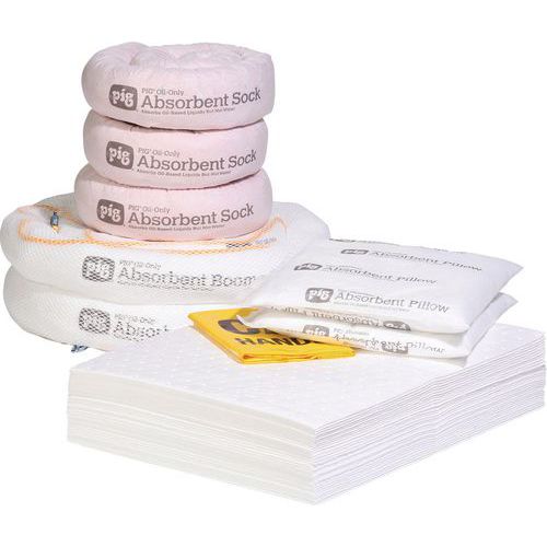 Contents: Refs. 443/444P017 – 35 PIG universal mat pads, 4 PIG pillows, 5 PIG blue absorbent socks, 5 poly disposal bags ties, 1 ‘When the spill strikes’ poster. Refs. 445/446P017 – 30 PIG HAZ MAT pads, 6 PIG HAZ MAT pillows, 3 PIG HAZ MAT socks, 2 PIG HAZ Mat socks, 5 poly disposal bags ties, 1 ‘When the spill strikes’ poster. Refs. 447/448P017 – 30 static dissipative mat pads, 2 PIG oil only pillows, 5 PIG oil only socks, 5 poly disposal bags ties, 1 ‘When the spill strikes’ poster.