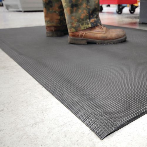 Textured mat designed for use in areas with possible oil, water or chemical spillage risks.