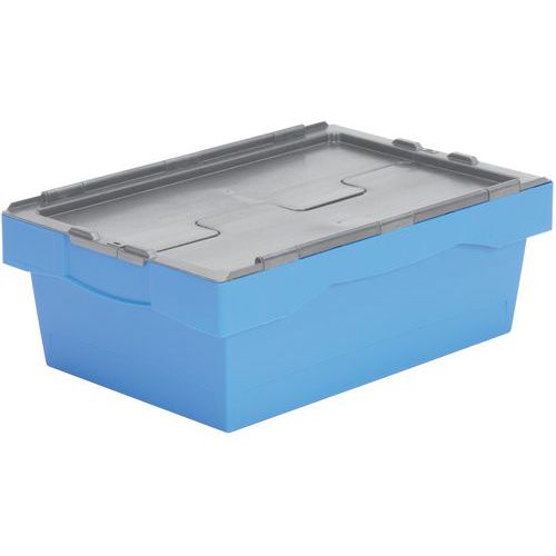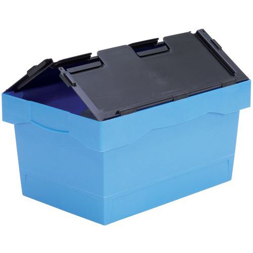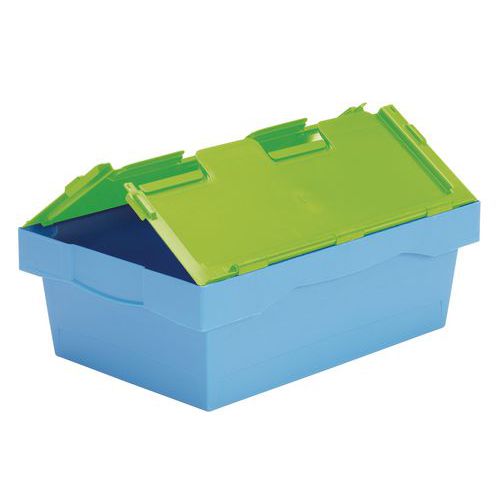 Identification of logistics flows facilitated by colour-coded lids. Multi-purpose, suitable for manual and automated handling. Contents secured via sealable and lockable lid. Containers can be stacked and nested when empty to save space.