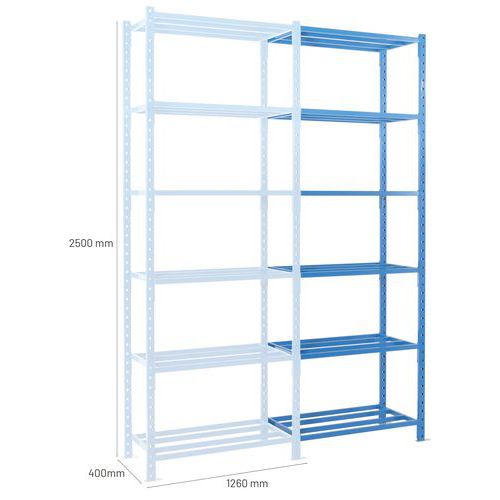Very stable shelving with a high load capacity (up to 2.5 t.). Tubular shelf to keep objects well ventilated and for easy maintenance. Easily extend your shelving with 1 or more add-on kits.