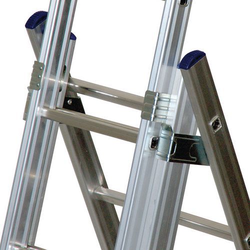 The ladder can be used as a straight extension, basic A-frame step, extended A-frame step or stairwell ladder.