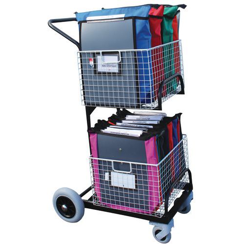 Compact mail distribution trolley with round handle. Handy-sized baskets L450 x D400 x H180 mm. Maximum load of 25 kg per basket. 2 rear wheels with a diameter of 200 mm. 2 front steering castors with a diameter of 100 mm. Mechanically welded tubular steel frame with epoxy coating. Polypropylene wheel body with polyurethane foam tyres.