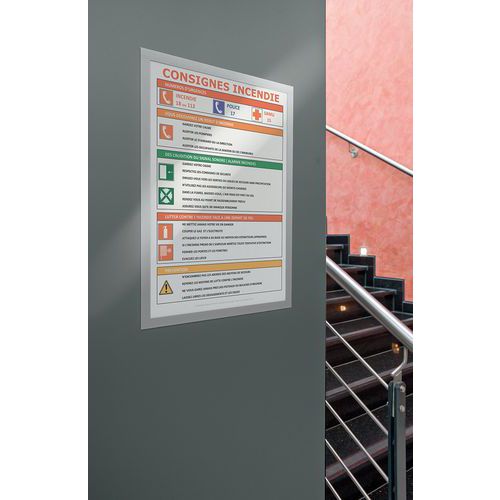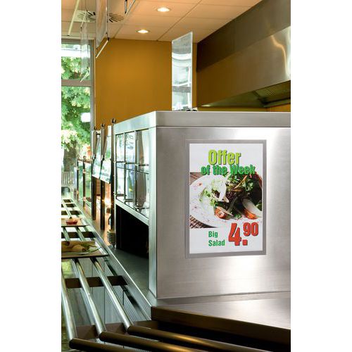 Duraframe® adhesive display frame for smooth surfaces. Thanks to the repositionable adhesive back, the frame sticks to and detaches from any smooth or rigid surfaces, such as walls or doors. If attached to a glass surface, both sides of the document can be read. Documents can be held secure and updated quickly and easily thanks to the magnetic surround. Can be used in portrait or landscape format.