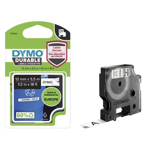 Dymo D1 Durable label, Background colour: White, Tape length: 3 m, Material: Polyester, Colour: Black Dymo D1 Durable label, Background colour: White, Tape length: 3 m, Material: Polyester, Colour: Black