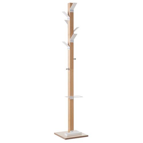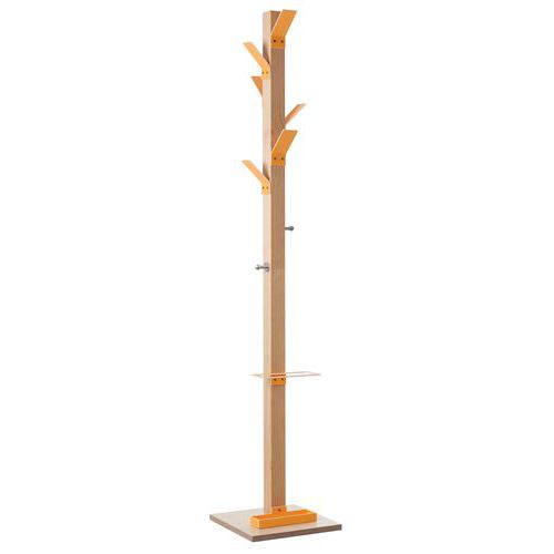Stylish coat rack with eight coat hooks with large hanging capacity. Umbrella holder for up to six umbrellas with large water collector. Solid varnished beech post with coloured coat hooks, umbrella holder and water collector. Perfectly stable coat rack with large square plywood base.