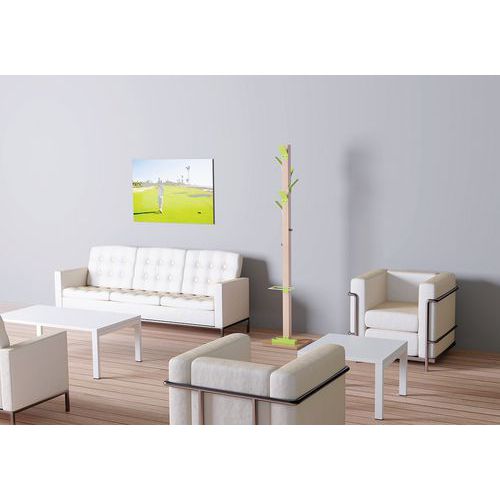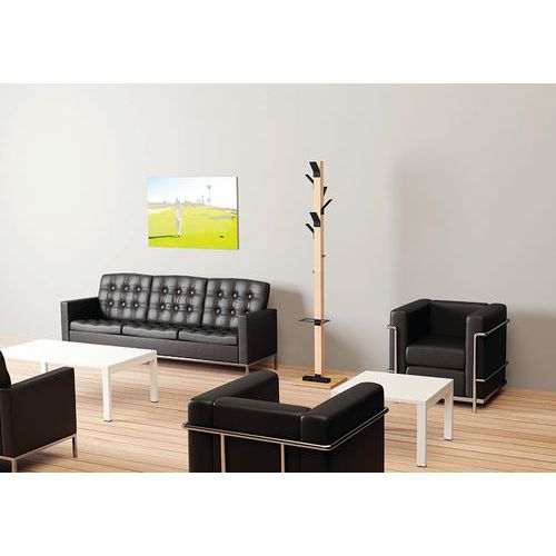 Six highly impact-resistant polystyrene coat hooks for clothing. Two chrome-plated steel hooks for accessories. Solid beech post, 60 mm x 60 mm cross-section. Plywood base 35 cm x 35 cm, 20 mm thick.