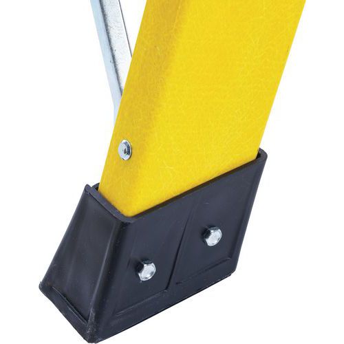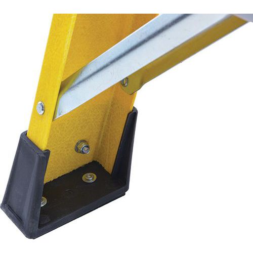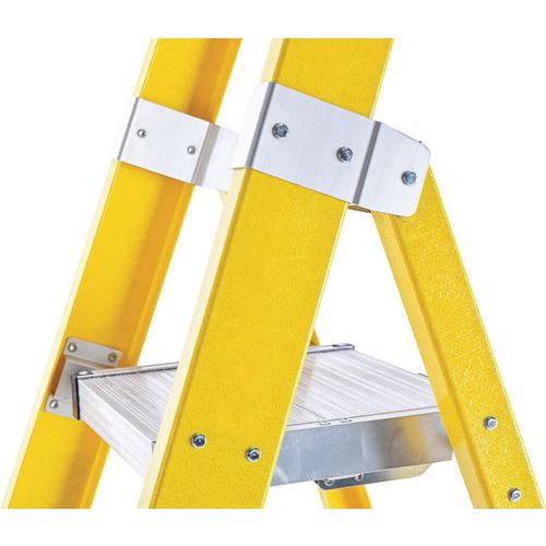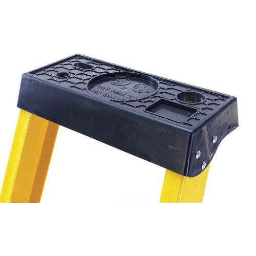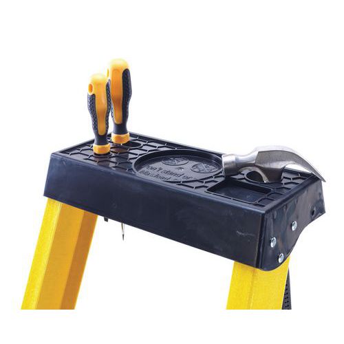 The Heavy-Duty Fibreglass step ladder range includes a multi-functional tool tray with non-conductive stiles - ideal for working around electricity. The fibreglass stiles resist up to 30,000 volts and meet EN61478. Reinforced 320x248mm checker-plate platform (platform steps only). Comfortable 80mm reinforced aluminium treads. Hinged metal locking stays provide greater stability. Box section back legs with heavy-duty bracing. The large feet angled cover more ground and reduce slip. Customer warranty : 5 years