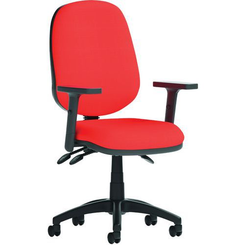 Breathable, height-adjustable mesh or fabric backs. Height adjustable, padded lumbar support. Dished seat design. Triple lever mechanism for seat height, seat and backrest tilt adjustment. Built to EN1335 standards. ANSI/BIFMAX 5.1-2017 strength and endurance tested. PCB: Permanent contact backrest feature. The 5-star base with castors allows the chair to easily move to where it is needed.
