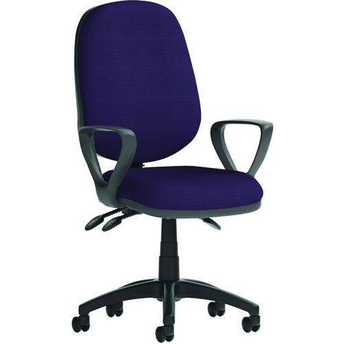 Breathable, height-adjustable mesh or fabric backs. Height adjustable, padded lumbar support. Dished seat design. Triple lever mechanism for seat height, seat and backrest tilt adjustment. Built to EN1335 standards. ANSI/BIFMAX 5.1-2017 strength and endurance tested. PCB: Permanent contact backrest feature. The 5-star base with castors allows the chair to easily move to where it is needed.