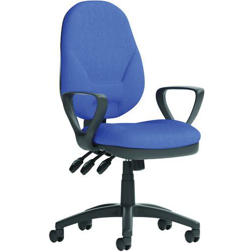 Large seat pad with waterfall front. Cushioned dished seat design. Contoured backrest for added comfort. Triple lever independent seat and backrest mechanism. Ratchet height adjustable backrest. PCB: permanent contact backrest. Optional height-adjustable armrests. The 5-star base with castors allows the chair to easily move to where it is needed.