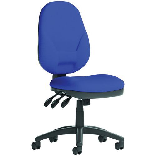 Large seat pad with waterfall front. Cushioned dished seat design. Contoured backrest for added comfort. Triple lever independent seat and backrest mechanism. Ratchet height adjustable backrest. PCB: permanent contact backrest. Optional height-adjustable armrests. The 5-star base with castors allows the chair to easily move to where it is needed.