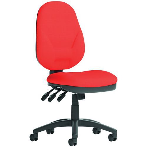 Large seat pad with waterfall front. Cushioned dished seat design. Contoured backrest for added comfort. Triple lever independent seat and backrest mechanism. Ratchet height adjustable backrest. PCB: permanent contact backrest. Optional height-adjustable armrests. The 5-star base with castors allows the chair to easily move to where it is needed.