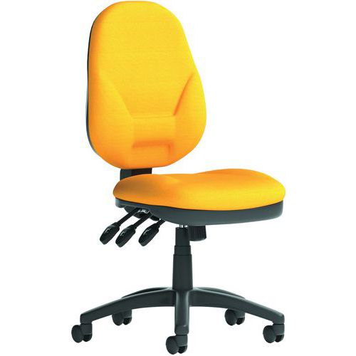 Large seat pad with waterfall front. Cushioned dished seat design. Contoured backrest for added comfort. Triple lever independent seat and backrest mechanism. Ratchet height adjustable backrest. PCB: permanent contact backrest. Optional height-adjustable armrests. The 5-star base with castors allows the chair to easily move to where it is needed.