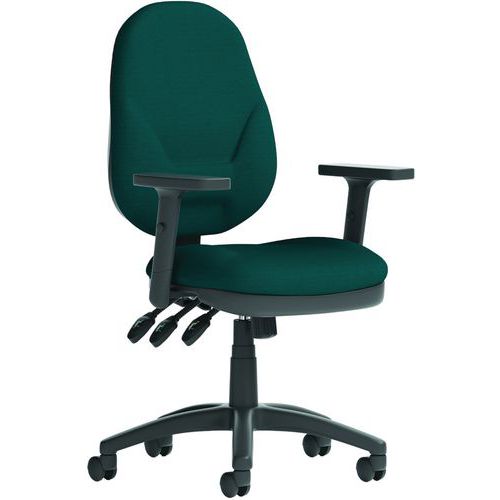 Large seat pad with waterfall front. Cushioned dished seat design. Contoured backrest for added comfort. Triple lever independent seat and backrest mechanism. Ratchet height adjustable backrest. PCB: permanent contact backrest. Optional height-adjustable armrests. The 5-star base with castors allows the chair to easily move to where it is needed.