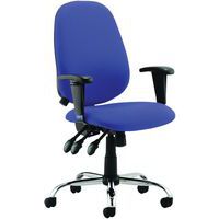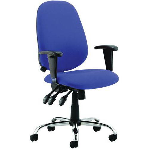 Contoured padded seat and backrest. Triple lever independent mechanism. Seat and backrest angle adjustment. Height adjustable ratchet backrest. Twist depth adjustable lumbar support. Weight tilt tension control. Height adjustable PU padded arms. The chrome 5-star base with castors allows the chair to easily move to where it is needed.