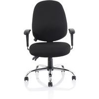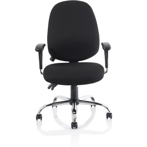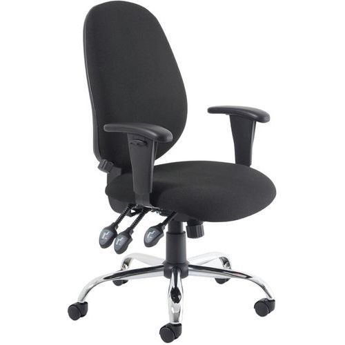 Contoured padded seat and backrest. Triple lever independent mechanism. Seat and backrest angle adjustment. Height adjustable ratchet backrest. Twist depth adjustable lumbar support. Weight tilt tension control. Height adjustable PU padded arms. The chrome 5-star base with castors allows the chair to easily move to where it is needed.