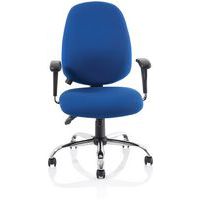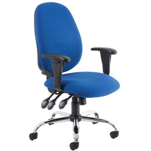 Contoured padded seat and backrest. Triple lever independent mechanism. Seat and backrest angle adjustment. Height adjustable ratchet backrest. Twist depth adjustable lumbar support. Weight tilt tension control. Height adjustable PU padded arms. The chrome 5-star base with castors allows the chair to easily move to where it is needed.