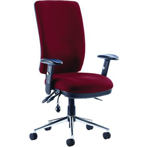 Approved by UK chiropractic doctors for posture support. Height adjustable backrest with fixed lumbar support. Contoured foam seat and back for extra comfort and support. Triple lever Synchro tilt mechanism. Seat slide. Polished chrome 5-star base with robust castors.